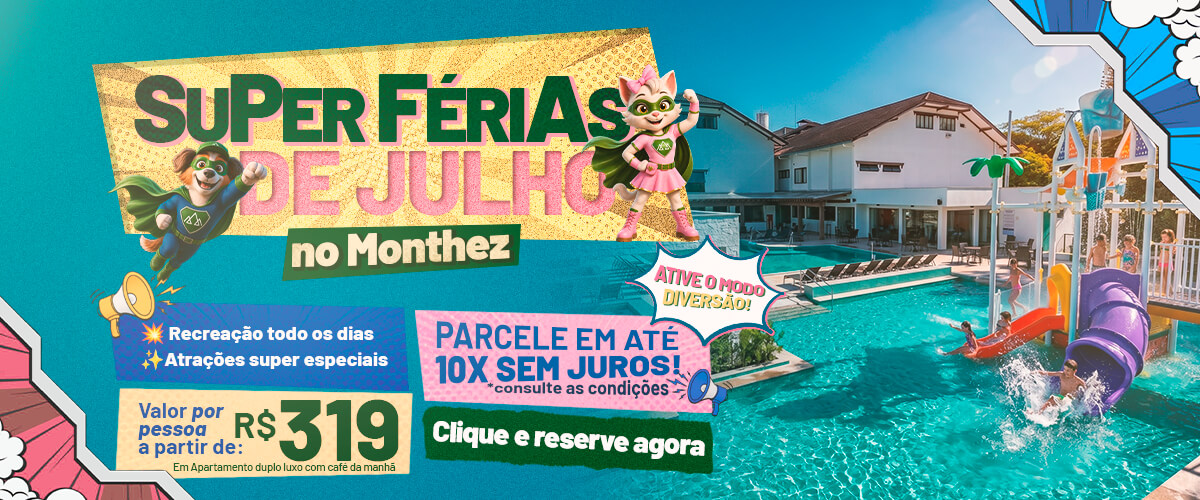 Prepare-se para viver as férias mais épicas do ano! 😍 Em julho, o Hotel Monthez convida você e sua família para uma experiência única com a campanha Super Férias 🦸♀️🦸♂️, inspirada no universo dos super-heróis. Aqui, cada detalhe foi pensado para transformar dias de descanso em uma verdadeira jornada de diversão, conexão e memórias inesquecíveis 💫👨👩👧👦